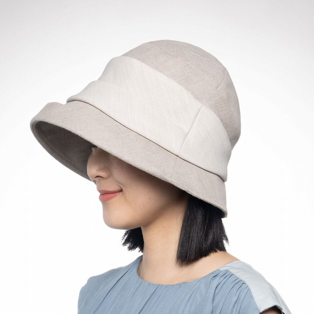 涼しげな麻素材を本体に、張り感のあるポリエステル素材をギャザー部分に使ったボリューム感のあるブルトンハット。